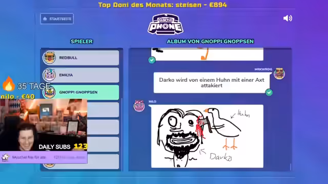 10:02:00Nilo und der Chat entwickeln fantasievolle und oft groteske Geschichten, wie zum Beispiel Darko, der von Hühnern misshandelt und getötet wird, oder Bodo, der an einem Zeppelin hängt und Kanzlerin wird. Diese Geschichten dienen als humorvolle Ablenkung und werden durch Zeichnungen visualisiert. Die Einmischung von Charakteren wie Marei und David, die tanzen oder sich Händchen halten, verstärkt die unterhaltsame und absurde Atmosphäre des Streams.