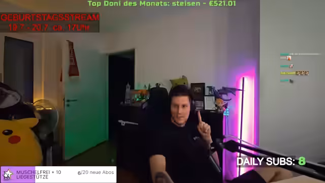 Es wurde der Marathon-Stream angekündigt. Der Läufer plant, 42 Kilometer von Düsseldorf nach Köln zu gehen, um persönliche Grenzen zu testen und seine Dankbarkeit für die Community auszudrusten. Der Stream dient als symbolische Geste gegen das Image des passiven Gamers und beweist mentale Stärke. Zudem wurde ein Geburtstagsstream für Samstag angekündigt.