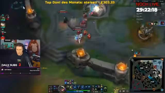 02:52:43Der Streamer analysiert intensiv ein gespieltes League of Legends-Spiel. Er ist frustriert über die Leistung seines Teams, insbesondere des Top- und Jungle-Laners, die sehr passiv und unkoordiniert gespielt hätten. Er kritisiert fehlende Vision und strategische Fehler, die zu mehreren Toden und letztlich zur Niederlage führten. Trotz seiner eigenen positiven Statistik (9-4) sieht er das Spiel als ungewinnbar an, da das Team nicht als Einheit agierte und das gegnerische Team eine starke Kombination hatte.