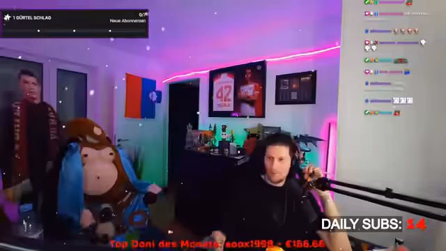 00:19:46Für das anstehende Wochenende wird ein durchgehender Stream angekündigt. Der Streamer plant, am Freitag, Samstag und Sonntag komplett zu streamen, inklusive eines Schlafstreams. Als Bestrafung für das Erreichen eines Zieles (Windchanger) wird er ein Affenkostüm tragen, speziell am 14. Dezember zum Weltaffentag. Es wird über die eklig werdende Nutzung des Kostüms drei Tage am Stück diskutiert, da er zu Hause keinen Trockner hat und das Kostüm waschen müsste.
