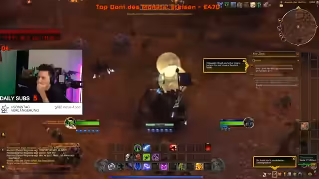 04:50:37Nach der Ankunft in der Scherbenwelt beginnen die Quests in der Ehrenfeste. Der Streamer und seine Mitspieler erhalten den Auftrag, durch das Dunkle Portal zu reisen. Dieses neue Event wird angetestet, wobei die genauen Aufgaben noch unklar sind. Gleichzeitig werden Spenden und Gegenstände im Spiel gehandelt, um den Goldbestand aufzustocken und Ausrüstung zu verbessern.