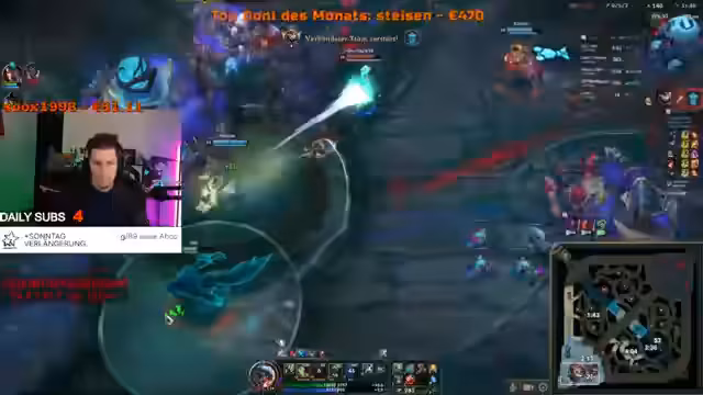 01:22:55Der Streamer spielt League of Legends und diskutiert intensiv seine Champions und Spielstrategien. Er identifiziert sich als spätes Spiel-Champion und erkennt an, dass sein Team zu viele späte Spiel-Champions hat, was zu einem schwachen Early-Game führt. Die Analyse zeigt, dass die Bot-Lane nicht die Logik hinter den Rollen verstanden hat und der Streamer frustriert über das Verhalten von Mitspielern ist, besonders über einen Pantheon, den er als kindisch beschreibt.