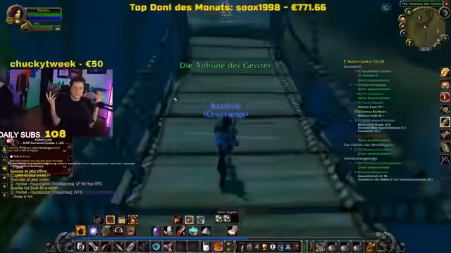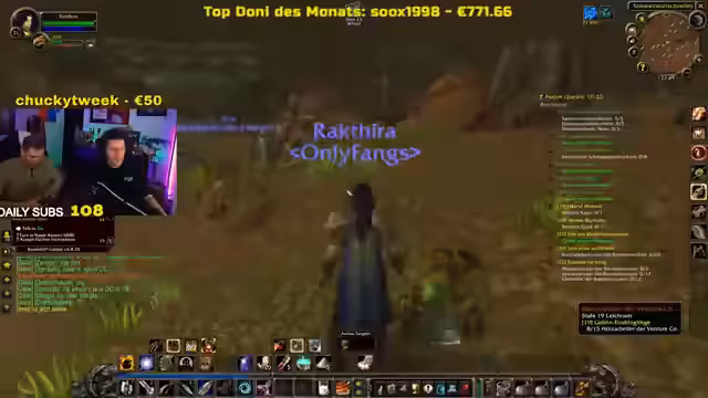 05:48:56Der Streamer unterhält sich mit der Community über das Gameplay von World of Warcraft, insbesondere über eine schwierige Quest, bei der er Hilfe benötigt. Gleichzeitig werden persönliche Themen angesprochen, wie die Abende der Community-Mitglieder und die allgemeine Tagesstruktur. Es werden auch wiederholte technische Probleme mit der Kamera erwähnt, die als frustrierend empfunden werden. Die Unterhaltung ist geprägt von einer lockeren, alltäglichen Atmosphäre und dem direkten Austausch mit den Zuschauern.