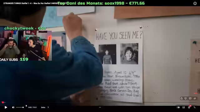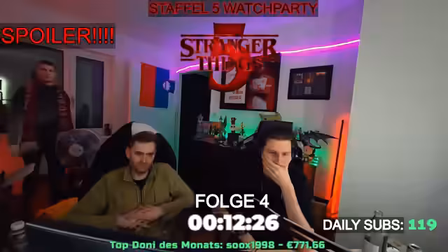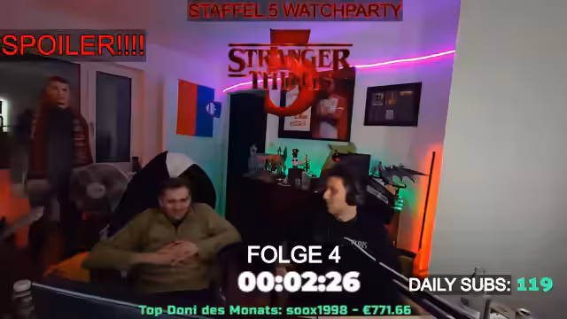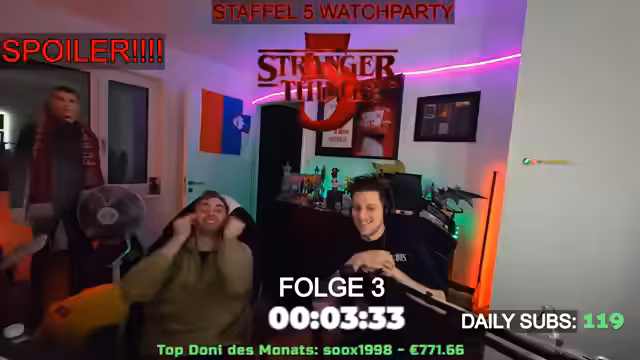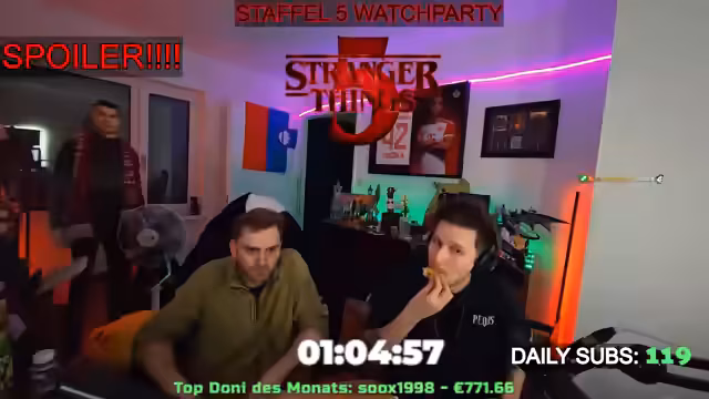 05:40:48Der Streamer kündigt eine gemeinsames Anschauen der neuen Staffel von Stranger Things an. Die Veranstaltung als sogenannte Watchparty ist für 2 Uhr nachts geplant und ist als ein „Einmalevent“ konzipiert, an dem sich mehrere Personen, darunter „David“ und „Cebu“, beteiligen werden. Sie werden mindestens die erste Folge der fünften Staffel gemeinsam schauen, auch wenn dies unter der Woche und in ungewöhnlich sparter Stunde stattfindet.