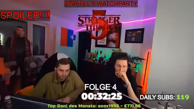 04:12:14Es wird eine Stranger Things Watchparty angekündigt, bei der Cebu die letzte Folge der vierten Staffel nachholt, um dann gemeinsam um 2 Uhr eine neue Staffel zu beginnen. Der Streamer zeigt sich verwundert darüber, dass Cebu die Serie über sein Handy schaut, anstatt über den Fernseher, um die Wiedergabegeschwindigkeit anzupassen. Er bietet ihm sogar den Fernseher an, was aber nicht angenommen wird. Die Vorbereitungen für die Watchparty sind im Gange, und es wird betont, dass die Zuschauer bereit sein sollten, da später Spoiler zur Serie besprochen werden könnten, obwohl der Streamer versucht, diese vorab zu vermeiden. Die Erwartungen an die neue Staffel sind hoch, insbesondere angesichts des enormen Budgets von 400 Millionen Dollar, was als Rekord für eine Serie gilt und die hohe Qualität der Produktion unterstreicht.