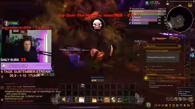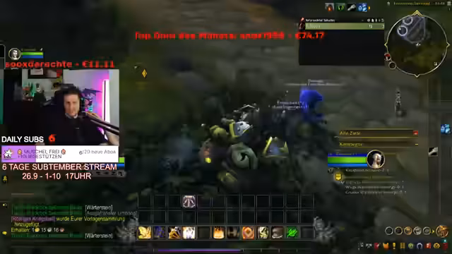 04:41:24Die Gruppe kämpft mit der Koordination bei der Quest 'Fall des Lichtkönigs'. Ein Spieler, Steisen, ist den anderen voraus und muss auf sie warten. Der Streamer erklärt genau, wo sich der Questgeber befindet, und dass die Quest für alle Gruppenmitglieder funktioniert, auch wenn nur einer die Gegner tötet oder die Kisten öffnet. Die Gruppe muss koordinieren, um sicherzustellen, dass jeder den richtigen Ort findet und nicht zu früh weiterläuft, was zu Verwirrung führt.