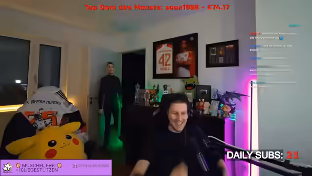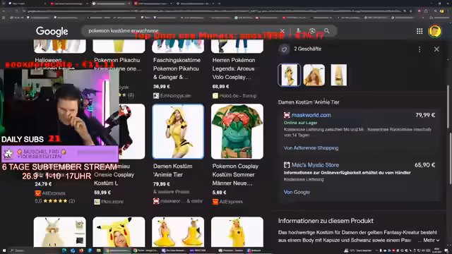 05:19:39Der Streamer verabschiedet sich und beendet den Stream für heute, deutet aber an, dass er möglicherweise morgen wieder live sein wird. Er bedankt sich bei den Zuschauern und wünscht ihnen einen guten Start ins Wochenende. Anschließend entspinnt sich eine Diskussion über Pokémon-Kostüme, insbesondere Onesies, und ob diese 'wack' sind. Der Streamer überlegt, ob er ein Glow-Riper-Kostüm für 100 Euro kaufen soll, fragt sich aber, ob man damit Feuer spucken kann. Er motiviert sich kurzzeitig, sich an der Kostümgestaltung zu beteiligen, entscheidet sich dann aber, ins Bett zu gehen und verabschiedet sich von weiteren Zuschauern. Die Diskussion dreht sich um verschiedene Pokémon-Kostüme, darunter Relaxo- und Team Rocket-Onesies, wobei der Streamer Bedenken hinsichtlich der Kapuzen und Kopfhörer äußert. Er entdeckt leicht bekleidete Pokémon-Kostüme und ist überrascht, während er gleichzeitig technische Probleme mit seiner Maus hat. Die Überlegung geht dahin, ein Gengar-Rucksack zu einem Pokémon-Outfit zu kombinieren. Es wird ein Swintia-Cosplay erwähnt, und der Streamer schlägt vor, ein Nachthara-Wonzie zu kaufen, um das Problem mit der Kapuze zu umgehen. Er scherzt über ein Bisaflor-T-Shirt und Pikachu-Ohren für sein Headset. Die Idee eines gelben Onesies mit Pikachu-Elementen wird diskutiert, und der Streamer macht Witze über anzügliche Details.