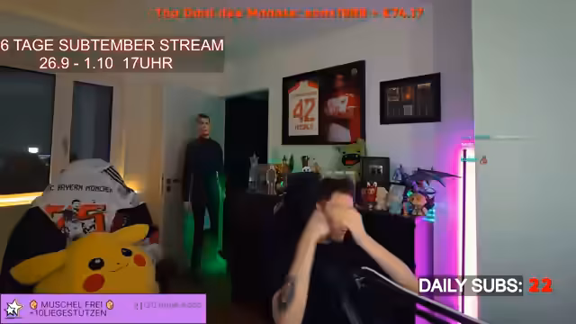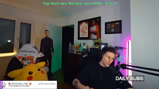 04:38:53Während des Streams kam es zu einer ungewöhnlichen und lauten Geräuschkulisse, die als lautstarker Furz identifiziert wurde. Der Streamer reagiert mit Humor und Verwunderung über die Intensität des Geräusches, das angeblich durch sein Mikrofon ging. Darko, der Betroffene, wird beschuldigt, für den Lärm verantwortlich zu sein, was zu spaßigen Kommentaren über Bassverstärker und die Kunst des Furzens führte. Die Störung sorgte für eine unerwartete Unterbrechung und Belustigung im Chat.