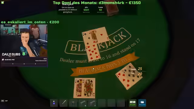 04:20:09Der Streamer erzielt erhebliche Gewinne im Spiel, steigert sein Konto auf über 3.200 und später sogar auf über 10.000. Er spricht über glückliche Gewinne und Setzstrategien, insbesondere beim Blackjack-Spiel. Gleichzeitig erleidet er auch erhebliche Verluste, bei denen er wieder auf Null oder ins Minus fällt. Die finanziellen Schwankungen sind ein zentrales Thema und zeigen das riskante und hochgradig unvorhersehbare Natur des Spiels.