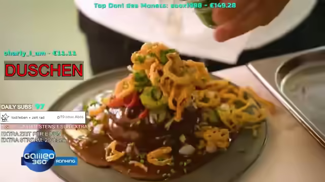 06:10:06In einem Berliner Imbiss kreiert Chaitan Singh eine indische Currywurst, die sich von der klassischen Variante durch die Verwendung von 14 indischen Gewürzen unterscheidet. Anstelle von Schweinebauch, Schweineschmalz oder Eisbrühe verwendet er reinen Schweinebauch und Rückenfett. Die Gewürze, darunter Muskatblüten, Chili und Kurkuma, werden angeröstet und zu einer würzigen Paste verarbeitet, die dem Schweinehack beigemischt wird. Auch die Soße bekommt eine indische Note durch die Verwendung von Sellerie, Zwiebeln, Karotten, Tomaten, Chili und indischen Lorbeerblättern. Die Currywurst wird in einer gusseisernen Pfanne gebraten und mit frittierten Zwiebeln und einem Bann serviert. Die indische Currywurst ist schärfer als die deutsche Variante und überrascht die Gäste mit ihrem ungewöhnlichen Geschmack.