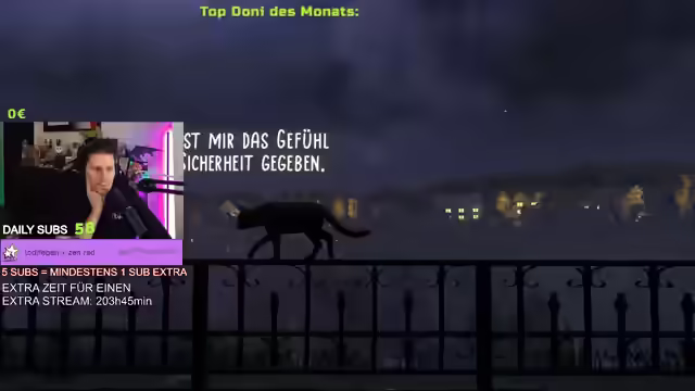 21:58:05Es wird erwähnt, dass das Valorant-Event bald endet und der Streamer ab 19 Uhr die Bude aufräumen muss, da David am nächsten Tag kommt. Der Streamer spielt das Katzenspiel weiter und kommentiert die Story. Es wird überlegt, ob die Katze die Omi umbringen soll. Der Streamer spielt das Spiel weiter und kommentiert die traurige Story. Es wird überlegt, ob die Katze die Omi ins Bett bringen soll. Der Streamer spielt das Spiel weiter und kommentiert die Story. Es wird erwähnt, dass die Katze sich langsam ans Zuhause gewöhnt. Der Streamer spielt das Spiel weiter und kommentiert die Story. Es wird erwähnt, dass die Untertitelung des ZDF von 2020 ist. Der Streamer spielt das Spiel weiter und kommentiert die Story. Es wird erwähnt, dass die Tochter die Katze nicht mag und die Oma zusammenbricht. Der Streamer spielt das Spiel weiter und kommentiert die Story. Es wird erwähnt, dass die Streaming-Karte für Subs und Donations genutzt wird. Der Streamer spielt das Spiel weiter und kommentiert die Story. Es wird erwähnt, dass Olive Hilfe braucht. Der Streamer spielt das Spiel weiter und kommentiert die Story.