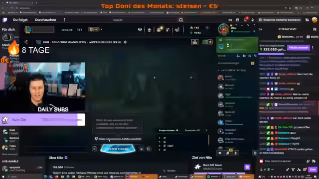 00:39:32Der Streamer wechselt zum Gaming-Modus, vorrangig das Spiel League of Legends. Es wird geplant, ein Duo- oder Flex-Spiel zu starten. Bei der Zusammenstellung des Teams taucht der neue, unbekannte Spieler 'Gabriel' auf. Dieser wird mit Skepsis betrachtet, da er neu im Stream ist und sich erst beweisen muss. Der Streamer und seine Community durchleiten Gabriels Chatverlauf der Vergangenheit, um zu beurteilen, ob er ein passender und zuverlässiger Mitspieler ist.