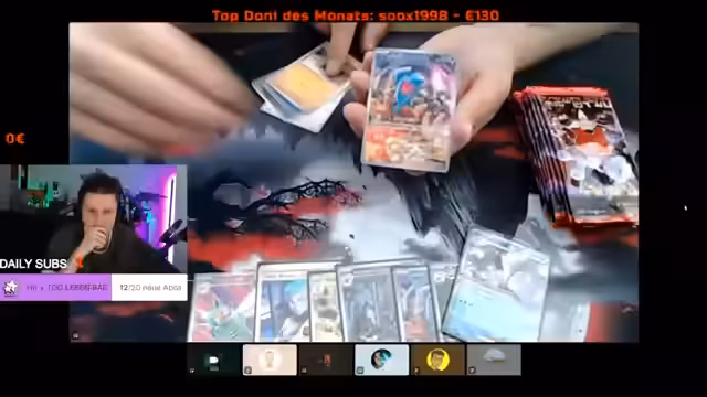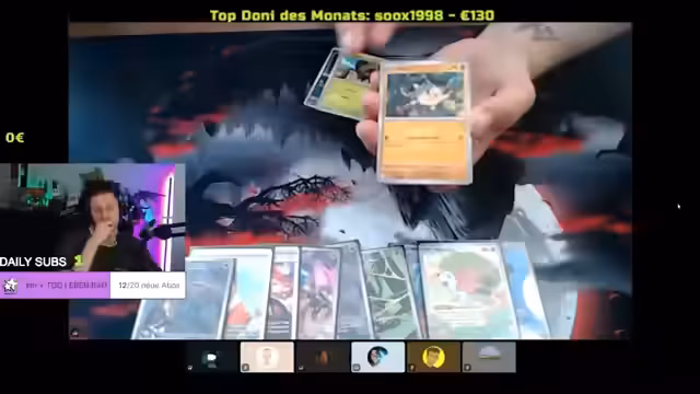 01:06:46Zu Beginn des Streams werden verschiedene Pokémon-Pack-Openings durchgeführt, wobei bedeutende Karten wie Giovanni und Mauzi gezogen werden. Die Streamer diskutieren über die Kartenwerte und zeigen Begeisterung über seltene Karten. Es fällt auf, dass mehrere Displays geöffnet werden und es immer wieder zu Überraschungen kommt. Die Atmosphäre ist geprägt von Wettbewerb unter den Streamern, wer die besten Karten zieht.
