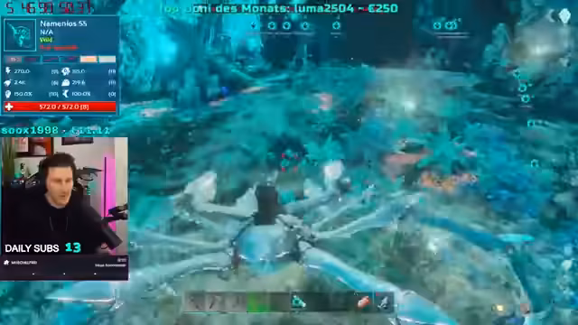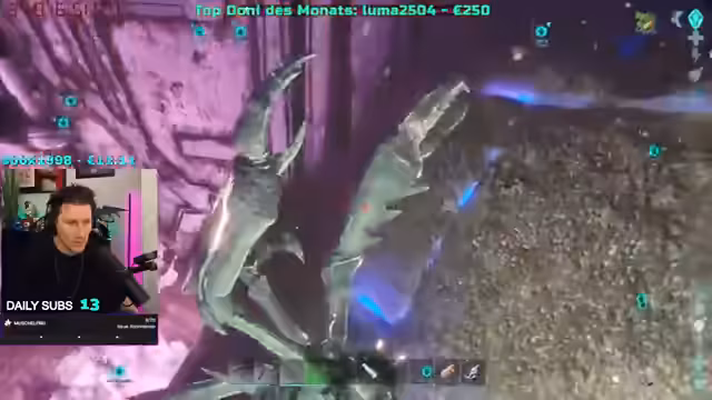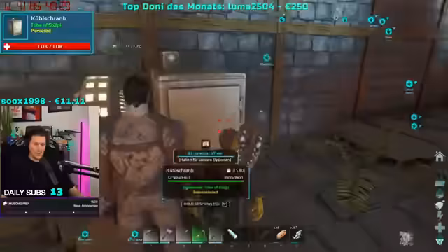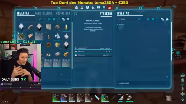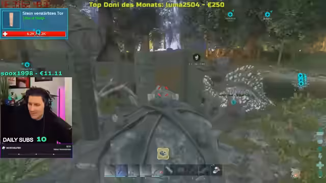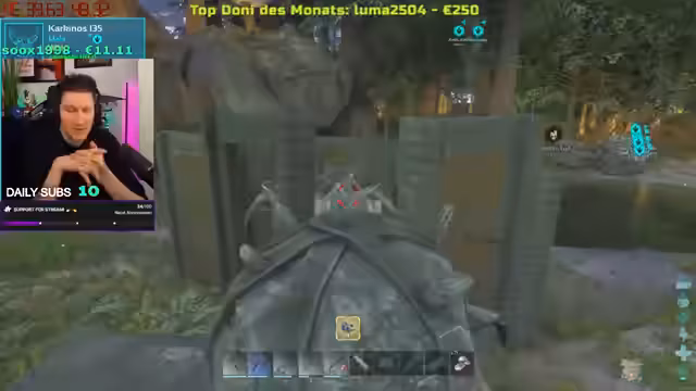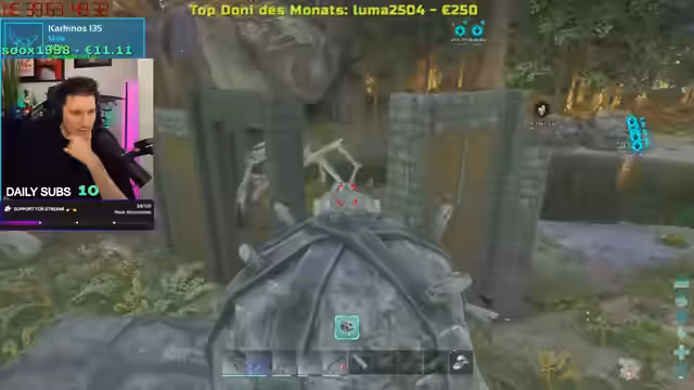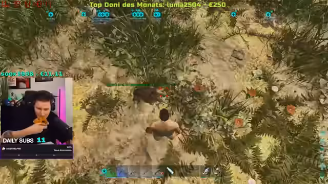 02:11:44Plötzlich ändert sich die Spielsituation dramatisch. Der Streamer berichtet von einem Krit-Effekt, den er auf ein Kralis angewendet hat, und beschreibt dies als krankhaft. Er entdeckt eine Auffangstelle für gefangene Dinos, die wie aus einer anderen Welt wirken. Parallel dazu wird von der Zubereitung eines Hühnchens mit Tannellini und Getoffelsalat berichtet. Ein technisches Problem im Spiel wird thematisiert: in einem Gebiet darf der Streamer nicht reinlaufen, da dort 'nameless' spawnen, er aber genau dieses Item benötigt, das aber 'safe bugged' ist. Die ständigen Spawns von Nameless an der eigenen Basis sorgen für Frustration.