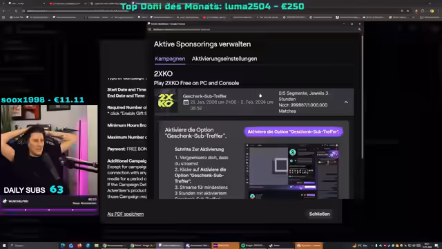02:16:03Das Gespräch wechselt zu einem wichtigen Ankündigungs-Thema: einer neuen Partnerschaft zwischen Twitch und Riot Games. Im Rahmen eines Events, das vom 11. Januar bis zum 1. Februar 2026 läuft, haben Partner die Möglichkeit, Bonus-Geschenk-Abos anzubieten. Für jedes gekaufte Paket von 5 Geschenkabonnements legt Riot ein Bonus-Geschenkabo drauf. Das Event gilt nur für Partner, die sich angemeldet haben und das Spiel '2xKO' streamen. Der Streamer analysiert die situation kritisch und fragt, ob sich eine Teilnahme finanziell lohnt, da die Community zwar zusätzliche Subs auslösen kann, man aber als Streamer für die reine Teilnahme an der Kampagne keine Grundauszahlung erhält.