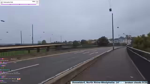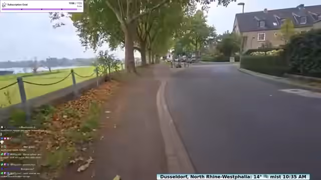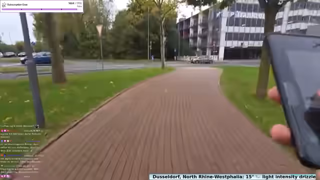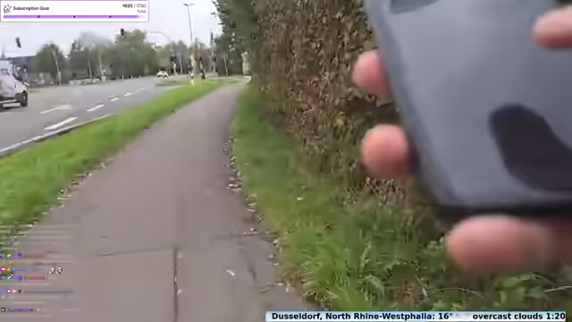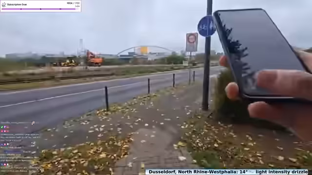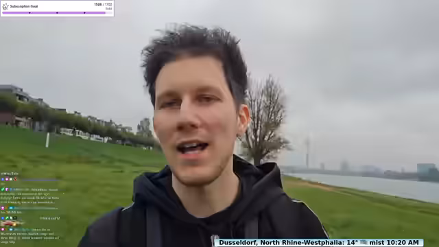 00:56:01Der Streamer setzt seinen Weg fort und geht in Richtung Neuss am Rhein entlang. Die geplante Route soll laut Navigationssystem etwa 43 Kilometer umfassen, aber die tatsächliche Distanz wird wahrscheinlich länger sein. Er beschreibt die Umgebung, darunter Wohnprojekte mit Blick auf den Rhein, die ihn beeindrucken. Es wird erneut das nieselnde Wetter erwähnt, das unangenehm bleibt, aber noch erträglich ist. Der Fokus liegt auf der Weiterbewegung, wobei der Streamer versucht, den Chat auf dem zweiten Handy zu verfolgen, während er sich auf den Weg konzentriert.