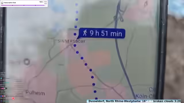 03:35:22Der Streamer startet die Wanderung von Düsseldorf nach Köln und bereitet sich technisch vor. Er erwähnt USB-C Anschlüsse, eine Powerbank und die hoffnungsvolle Internetverbindung im ländlichen Gebiet. Körperliche Schmerzen werden bereits angesprochen, da er keine spezielle Vorbereitung hatte. Die Route wird als ländlich beschrieben, mit der Hoffnung, dass das Internet funktioniert, während er kurzfristige Pausen einplanen muss. Diese Phase setzt den Start der 42-Kilometer-Wanderung in den Kontext von technischer Vorbereitung und ersten körperlichen Belastungen.