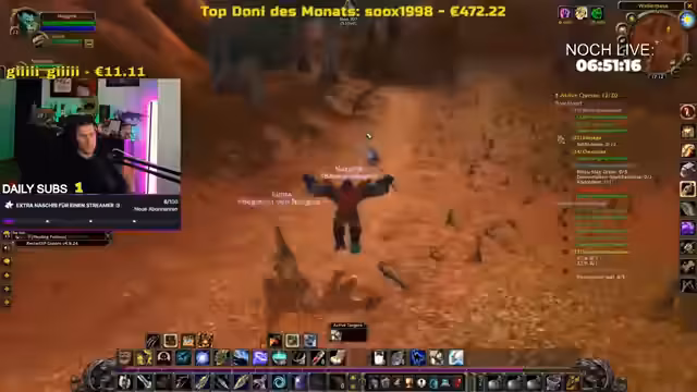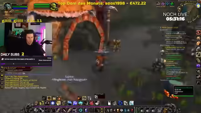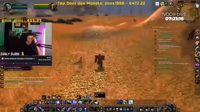 03:57:22Der Streamer befindet sich im Spiel in der Region Ashenvale und versucht, die Gruppe an ein anderes Ende der Karte zu führen. Es werden Schwierigkeiten beim Navigieren und bei der Orientierung beschrieben. Währenddessen wird ein neu erreichter Level-Stein gefeiert und der Verbleib eines anderen Spielers namens Darko thematisiert.