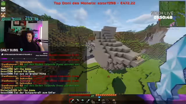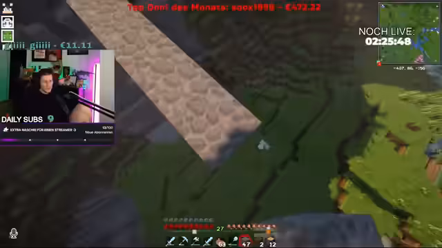 07:22:30Der Streamer merkt zunehmend seine Erschöpfung an, da er in wenigen Stunden einen Flug antreten muss und kaum geschlafen hat. Gleichzeitig kommt es zu mehreren Problemen im Minecraft-Server, wie z.B. serverbedingte Todesfälle, bei denen Inventare verloren gehen. Die Farm zur Ressourcengewinnung funktioniert nicht wie erwartet und den Spielern machen nervige Kreaturen das Leben schwer.
