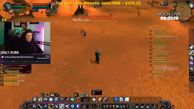 02:12:05Eine sehr gefährliche Situation entsteht, als der Streamer einem Elitegegner mit mehreren Begleitern gegenübersteht. Er kämpft gegen acht Gegner, sein Charakter stirbt fast. In einem entscheidenden Moment wird er von einem anderen Spieler geheilt, was sein Leben rettet und als "ehrenhaft" beschrieben wird. Dieser Moment unterstreicht die hohe emotionale Beteiligung im Hardcore-Modus.