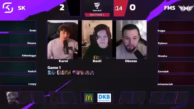 01:19:28Nach einem technischen Problem und einem Remake der ersten Lobby, das dem Spiel startlich den Wind aus den Segeln nimmt, werden interne teaminterne Spannungen bei SK angedeutet. Der Streamer unterhält sich über den SK-Support Krepo und macht sich über die Aufstiegsschwierigkeiten von Kani lustig. Parallel dazu wird eine Verletzung bei FMS-Spieler Aurora gemeldet, was das Matchup beeinflussen könnte. Der Fokus liegt auf der Wiederaufnahme des Spiels und der Analyse der veränderten Drafts.