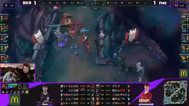 01:26:36Das erste Spiel zwischen BKROG und FMS verlief intensiv mit ausgefechtenen Teamkämpfen und strategischen Fehlern. BKROG konnte letztlich durch ein starkes Nashor-Push gewinnen, obwohl FMS sich hartnäckig zur Wehr setzte und sogar comeback-ähnliche Situationen schuf. Der Kommentator kritisierte, dass professionelle Spiele oft nach wenigen Minuten entschieden scheinen und bemängelte die mangelnde Vielfalt in der Champions-Auswahl, was die Spiele teilweise vorhersehbar macht. FMS zeigte jedoch individuell starke Plays, was den Sieg BKROGs nicht schmälert.