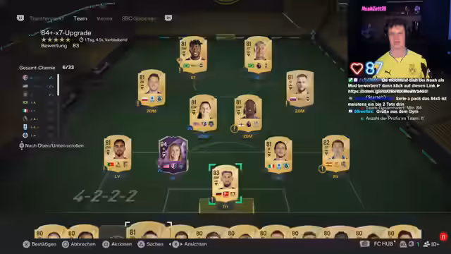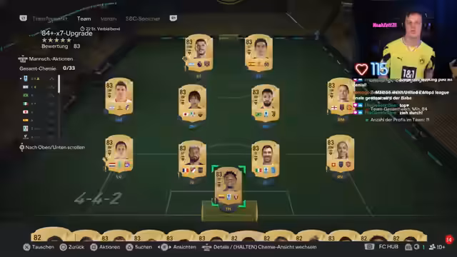 00:06:12Der Streamer begrüßt seine Zuschauer und kündigt den Live-Stream an. Berichtet von einer vorausgegangenen belastenden Nacht und startet den Stream mit leichten technischen Schwierigkeiten, wie Problems mit der Kopfhörerverbindung und schlechter Songqualität. Er stellt sein FIFA Ultimate Team-Setup mit Pulsuhr und dem Team für den anstehenden Weekend League (WL) Stream vor und kündigt eine besondere Fitness-Challenge an, die mit den Spielen verknüpft ist.