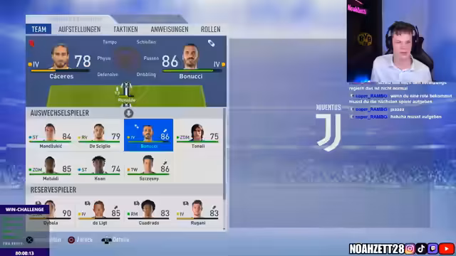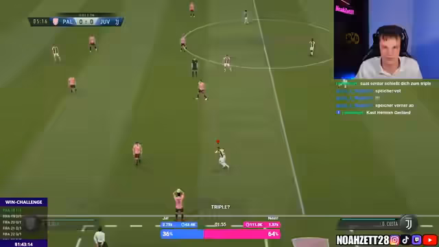 11:05:37In der letzten Saison der FIFA 19 Karriere mit Juventus Turin ergibt sich noch einmal die Chance auf das Triple. Der italienische Pokal gegen AC Mailand steht an, gefolgt vom Champions League Finale gegen Manchester City. Der Streamer und der Chat drücken sich gegenseitig die Daumen. Das Pokalfinale wird gewonnen und die Vorbereitung auf das Finale gegen Manchester City beginnt. Das Spiel ist von Anfang an intensiv und Juventus geht in Führung. Manchester City übt jedoch großen Druck aus und der Streamer muss sich auf eine starke Defensive verlassen. Durch eine kämpferische Leistung und ein weiteres Tor gelingt es Juventus, das Spiel für sich zu entscheiden und die Champions League zu gewinnen. Nach 13 langen Seasons hat es Juventus endlich geschafft und ist draußen aus FIFA-fucking 19.