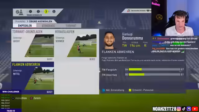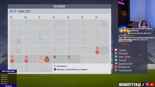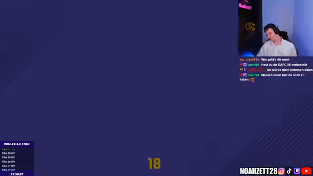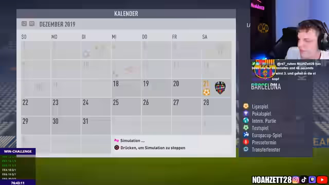 00:07:01Der Stream beginnt mit einer freundlichen Begrüßung der Zuschauer und dem Wunsch nach einem schönen Wochenende. Es folgen Neuigkeiten von einem Ausflug nach Bielefeld. Hauptthema ist die '56 Stunden Triple Nostalgie Karriere Win Challenge', ein großes Finale, bei dem das Ziel ist, mit Barcelona in FIFA 25 das Triple zu holen. Trotz anfänglicher Schwierigkeiten und der aktuellen Position in FIFA 18, wird ein intensives Spektakel erwartet. Es wird betont, dass es nicht darum geht, 56 Stunden durchzuspielen, sondern so lange wie möglich wach zu bleiben und zu spielen, bis zur Erschöpfung. Der Erfolg der Challenge hängt stark vom Glück ab. Der Streamer präsentiert sich im Hemd, um die Seriosität zu unterstreichen und die Entschlossenheit, die Challenge zu meistern.