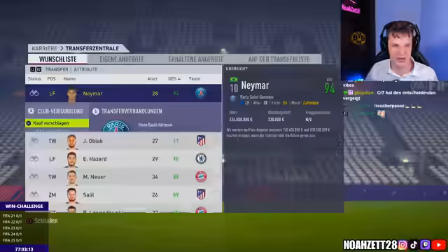 01:36:27Zunächst wird Ronaldos Leistung in der Liga hervorgehoben, trotz eines vergebenen Elfmeters. Es folgt die sofortige Reinvestition in Neymar, um das Team zu verstärken. Kritik an Spielern wie Sergio Roberto, der den Pfosten trifft, wird laut, was als potenzieller Rückschlag gesehen wird. Die Transferphase beginnt mit dem Ziel, Nene zu verpflichten, wobei ein Angebot von 150 Millionen im Raum steht. Nehmer wird mit einem Fünfjahresvertrag und einem leistungsbezogenen Bonus von 10 Millionen für fünf Tore ausgestattet. Die Simulation der Saison wird fortgesetzt, wobei der Fokus auf Schlüsselspielen und Spielerleistungen liegt. Es gibt Überlegungen zu Wechseln und zur Bankbesetzung, insbesondere im Hinblick auf Neymar gegen seinen Ex-Club. Die Bedeutung von Griezmann und Pogba für den Erfolg des Teams wird betont, während Verletzungen, wie die von Thema, das Team vor Herausforderungen stellen.