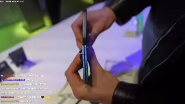 00:38:18Der Fokus liegt auf den faltbaren Geräten von Samsung. Der Streamer präsentiert das Galaxy Fold, das im eingeklappten Zustand kaum dicker als ein normales Smartphone ist. Ein direkter Vergleich mit dem iPhone 15 Pro Max verdeutlicht die beeindruckende Verdünnung der Technik. Der Streamer sieht das折叠Gerät als Fortschritt und besonders für Leute, die viel mit ihrem Gerät arbeiten, als sehr nützlich an, auch wenn er das Android-Betriebssystem und die Emojis von Samsung als Verbesserungspotenzial sieht.