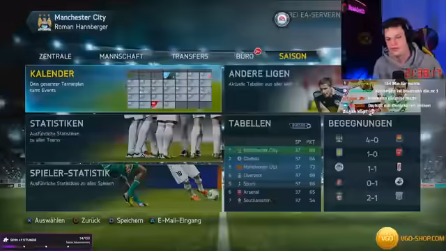 04:45:18Nach einem Vereinswechsel startet eine neue Karriere in FIFA 14. Der Saisonverlauf ist dramatisch und endet damit, dass der Tabellenfirstenplatz verspielt wird. Letzter Hoffnungsträger ist der FA-Cup-Finale gegen Liverpool. Das Spiel ist ausgeglichen und endet 1:1. Ein Münzwurf entscheidet über das Weiterkommen. Der Streamer verliert, was das Scheitern an der Challenge bedeutet und den Wechsel in das nächste Spiel FIFA 15 bedeutet.