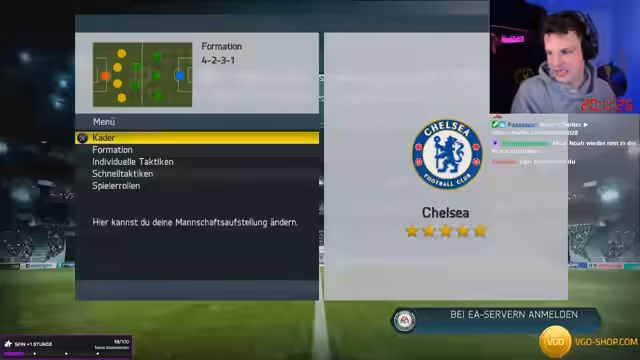 04:13:03Nach dem Misserfolg mit Liverpool wird der Verein gewechselt und Chelsea übernommen. Um den Kader aufzuwerten, werden teure Stars wie Manuel Neuer und Sergio Ramos verpflichtet. In der Champions League scheitert Chelsea jedoch im Achtelfinale am FC Barcelona. Die Meisterschaft wird am letzten Spietag durch eine Niederlage verspielt, was den Streamer verärgert und zu einem Wechsel zu einem neuen Verein für die nächste Saison motiviert.