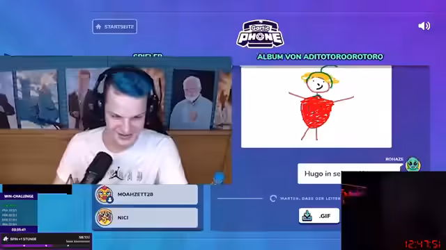 11:44:14Im Stream wurde ein interaktives Zeichenspiel veranstaltet, bei dem der Streamer versucht, durch Zeichnungen und Pfeile Begriffe aus dem Chat zu erraten. Das Spiel führte zu vielen lustigen und oft abstrakten Ergebnissen, da die Zeichnungen schwer zu interpretieren waren. Dies sorgte für eine unterhaltsame und gemeinschaftliche Atmosphäre und wurde mit zahlreichen Spenden und Reaktionen der Community unterstützt.