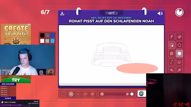 19:32:00Ein interaktives Spiel wird veranstaltet, bei dem der Streamer und die Zuschauer versuchen, komplexe Szenen nur durch Zeichnungen zu beschreiben und zu erraten. Die Aufgaben werden dabei immer absurder und gehen von harmlosen Darstellungen bis zu explizit und vulgären Inhalten. Das Spiel eskaliert in seiner Komplexität und der Hilflosigkeit des Streamers, der sich als farbenblind bezeichnet, aber dennoch versucht, die skurrilen Aufgaben zu meistern.