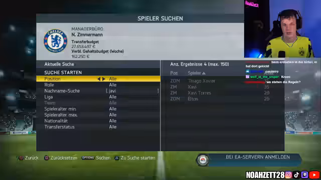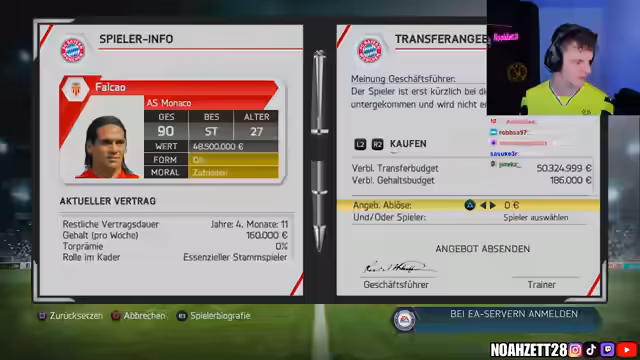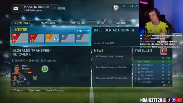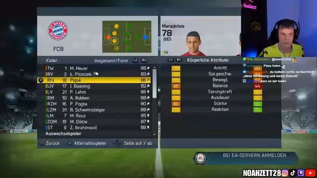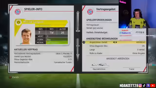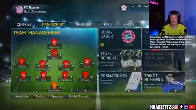 00:31:51Der Streamer startet die FIFA 14 Karriere mit dem FC Bayern München, nachdem das Glücksrad diesen Verein ausgewählt hat. Er plant eine zukunftsorientierte Transferpolitik, um nicht nur in der ersten Saison erfolgreich zu sein, sondern auch langfristig Triples zu gewinnen. Die Schwierigkeit wird auf Weltklasse eingestellt und die Finanzen auf milde. Zunächst wird der Kader analysiert und entschieden, welche Spieler verkauft oder verliehen werden sollen. Toni Kroos soll verkauft werden, da er im Vergleich zu Mario Götze ein schlechteres Preis-Leistungs-Verhältnis aufweist. Es werden Überlegungen angestellt, welche Spieler von anderen Vereinen verpflichtet werden sollen, um die Konkurrenz in der Bundesliga auszuschalten. Dabei werden unter anderem Spieler von Borussia Dortmund ins Auge gefasst. Der Streamer plant, sowohl junge Talente als auch erfahrene Spieler zu verpflichten, um eine ausgewogene Mannschaft zu haben.