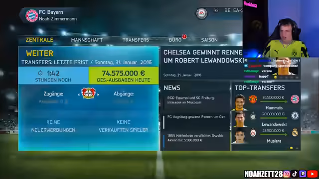 03:34:12Es wird über die Notwendigkeit eines neuen Verteidigers diskutiert, nachdem ein Angebot für Piqué abgelehnt wurde und Marquinhos nicht verfügbar ist. Mats Hummels wird als mögliche Verstärkung in Betracht gezogen und schließlich für 30 Millionen Euro verpflichtet, während gleichzeitig Lengerek abgegeben wird. Ronaldo ist weiterhin oft verletzt, was die Planung erschwert. Marc-André Ter Stegen bleibt im Fokus, wird aber nicht teurer. Benteke und Muriel werden als mögliche Transfers diskutiert. Lewandowski wechselt für 28 Millionen Euro zu Chelsea. Muslera wechselt zu Real Madrid. Es wird überlegt, ob man Neuer zurückholen soll. Es wird festgestellt, dass Dortmund keine Gefahr mehr darstellt. Das Viertelfinale gegen Fortuna Düsseldorf steht an. Die Transferphase ist fast vorbei. Es wird gehofft, dass Bayern endlich den Titel holt. Müller, Ramos und Ronaldo fehlen verletzungsbedingt.