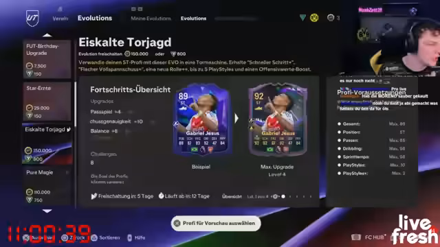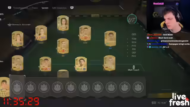 00:16:18Die Stream beginnt mit dem Bau eines neuen FIFA-Teams für die Weekend League. Nachdem er und sein Team über die SBC-Packs 85 x 3 und 85 x 5 gesprochen haben, zieht er 85 x 3 und beginnt mit dem Team-Aufbau. Der Fokus liegt darauf, ein starkes Team um Borussia-Dortmund-Spieler wie Siro Girassi zu bauen, um später eine Evo-Karte zu erstellen und das Team für die Weekend League zu optimieren.