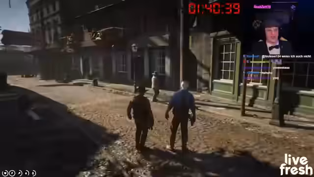 11:20:28Die Charaktere treffen auf den Deputy von Valentine, der sich als "Colt" vorstellt. Sie schildern ihm ihre Situation und ihre besondere Zusammenarbeit. Der Streamer erklärt, dass er eine Versetzung nach Valentine anstrebt, da dort mehr Aktivität und eine bessere Chance auf Informationen über die Bande herrschen würde.