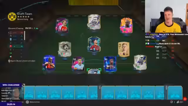 00:01:11Der Streamer beginnt mit dem Ziel, die sogenannte WIN Challenge zu meistern. Es geht direkt in die Auswahl der Spieler (Draft), da eine erfolgreiche Durchführung entscheidend für den Verlauf des Streams ist. Nach einem holprigen Start, bei dem die ausgewählte Formation zunächst als problematisch erscheint, beginnt eine detaillierte Diskussion über die Besetzung der Positionen. Besonders auf dem Flügel gibt es Unsicherheit, ob ein besserer Spieler zur Verfügung steht. Letztlich wird der Kader vervollständigt und der Streamer ist zuversichtlich, ein starkes Team zusammengestellt zu haben, das dem Meta-Trend entspricht.