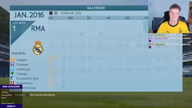 00:45:20Nach den Rückschlägen in der Challenge wechselt der Streamer den Modus und simuliert stattdessen eine Karriere. Das Ziel bleibt, einen Triple-Meister zu gewinnen, wobei er sofort den DFB-Pokal verliert. Der Streamer unterbricht das Gaming, um mit seinem Publikum über persönliche Themen zu sprechen, darunter Ernährung, der Kauf eines E-Bikes und die Einnahme von Nahrungsergänzungsmitteln. Er kündigt an, die Win Challenge fortan regelmäßig an Samstagen durchzuführen und gibt Einblicke in seine täglichen Routinen und zukünftige Streaming-Pläne.