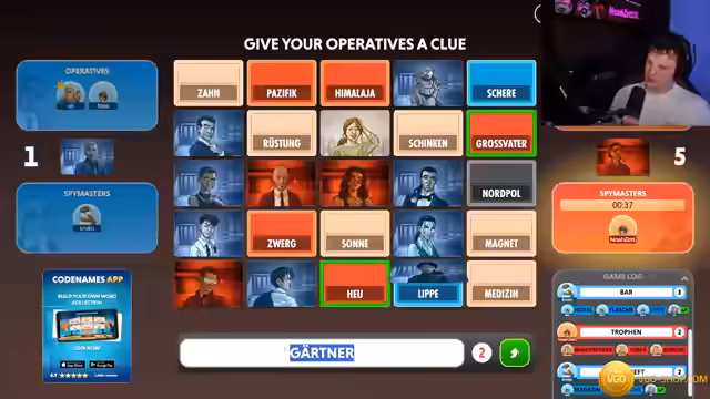 04:36:48Die Spielregeln werden erklärt: Der Spymaster gibt ein Wort mit einer Zahl, die die Anzahl der verknüpften Begriffe angibt. Das Team muss versuchen, diese Begriffe durch Assoziation zu finden. Jedes Team hat einen Spymaster und die restlichen Mitglieder sind Operative, die die Wörter raten. Nach anfänglichen technischen Schwierigkeiten beim Beitritt ins Spiel beginnt das erste Spiel. Ein Teammitglied fühlt sich überfordert und bittet um Hilfe von seinem Spymaster.