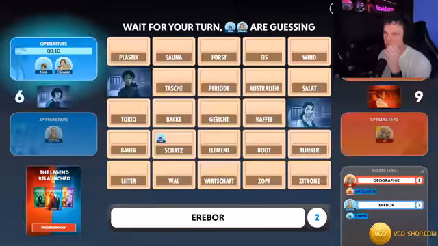 05:27:05Nach der Revanche eskaliert die Situation spielerisch, als sich die Spieler gegenseitig 'giften'. Ein neues Spiel startet mit komplett neuen Teams und einem anderen Spymaster. Die Begriffsfelder sind diesmal geografisch orientiert. Die Spieler haben Schwierigkeiten, eine genaue Verbindung zu Begriffen wie 'Tokio' und 'Mount Fuji' herzustellen und diskutieren über mögliche Fehlinterpretationen.