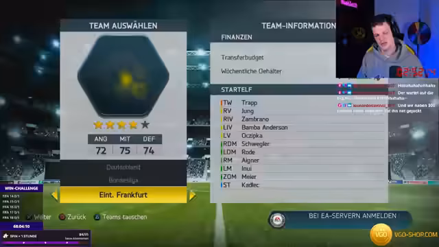 16:57:57Zu Beginn der Nostalgie-Karriere-Win-Challenge wird eine Reihe von FIFA-Nationen gezogen, die spezifische Strafen für den Streamer bedeuten. Für Kamerun droht das Rasieren einer Augenbraue, für Kroatien das Halbart-Rasieren. Bei Schalke 04 soll er mit einem Trikot des Vereins streamen, was er als schlimmste Strafe bezeichnet. Für England muss er möglicherweise die gesamte Weekend League in einem Harry-Maguire-Trikot bestreiten. Bei Brasilien und Frankreich gibt es ebenfalls konkrete Strafenideen, die jedoch nicht endgültig bestätigt werden. Die Ziehung von Patrick Vieira, einem zentralen Verteidiger-Icon, löst eine positive Reaktion aus und beendet eine Krise bezüglich des benötigten Spielertyps.