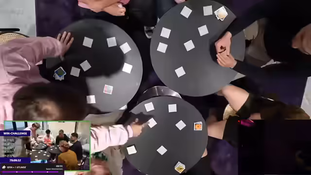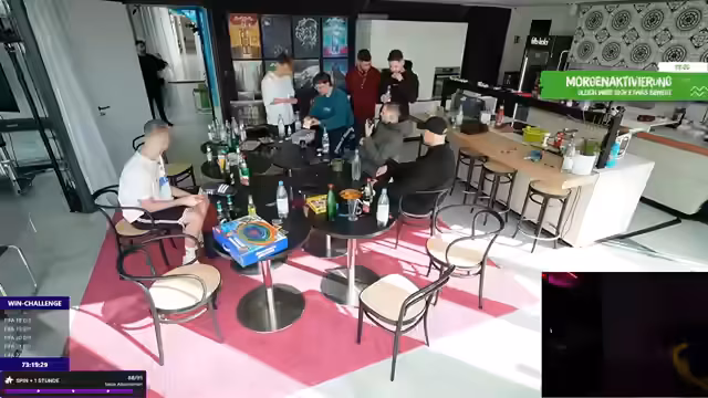 16:38:28Für die Verlierer der Challenge werden Strafen angedroht. Eine davon ist ein Jenga-Spiel, bei dem die drei Verlierer für zwei Stunden aneinandergekettet werden. Der Erste muss eine Perücke tragen, der Zweite ein Kostüm und der Dritte muss in der Mitte stehen. Der Streamer selbst verliert eine Runde und muss aufbauen, während ein anderer Teilnehmer ebenfalls verliert und eine Strafe erhält.