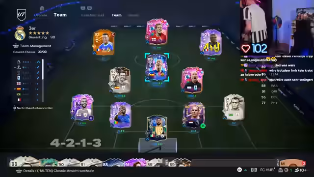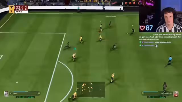 02:03:59Der Stream beginnt mit intensiven Kommentaren zu einem Fußballspiel, das offensichtlich aus der FIFA-Wochenliga stammt. Kommentiert werden fehlerhafte Pässe, eine offene rechte Seite des Spielfeldes und ein defensiver Fokus. Der Kommentator ist frustriert über den mangelnden Spielfluss, die Taktik und die Leistung seiner Spieler, insbesondere den häufig kritisierten 'Peter Crouch'. Sein Puls wird thematisiert und er beschreibt eine angespannte Situation am Ende der Partie mit 15 Minuten Restspielzeit.