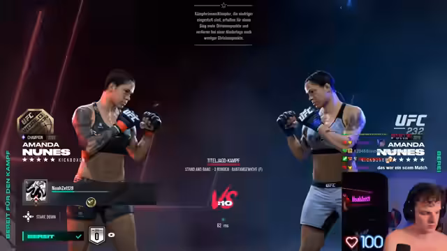 05:42:02Nach dem Experiment mit dem Schmuggelsimulator, der als frustrierend und nicht sinnvoll empfunden wird, wechselt der Streamer die Spiele erneut. Diesmal startet er einen UFC-Kampf im Stand-up-Modus, bei dem ausschließlich geschlagen werden darf. Ein Ranked-Match beginnt, bei dem er gegen einen erfahrenen Gegner antritt und eine klare Niederlage hinnehmen muss.