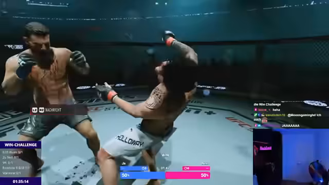 04:11:48Nach anhaltenden Anstrengungen und trotz der Hindernisse, gelingt dem Streamer ein entscheidender Durchbruch. Er schafft es, zwei Siege hintereinander zu erringen und seiner 'Winchurch' einen Schritt näher zu kommen. In einem intensiven Kampf gegen Max Holloway erreicht er den entscheidenden Sieg und schafft das Ziel, den Titel in der UFC-Simulation zurückzuerobern.