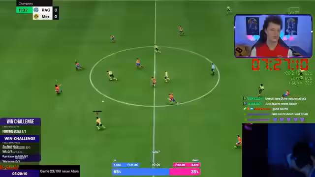 12:05:36Der Streamer beginnt mit einer intensiven FIFA-Partie, in der er von einem Rückstand von 6:6 auf 7:6 aufholt. Er beschreibt die Taktiken wie die 'volle Mett-Taktik' und betont die hohen Geschwindigkeitswerte der Spieler. Besonders hervorgehoben wird der Spieler 'Sokrates', der getestet wird und mit seinem Tempo überzeugt. Das Spiel bleibt bis zum Ende spannend und der Streamer versucht, den Sieg zu sichern, wobei er eine ansprechende Leistung zeigt.
