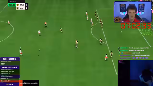 07:47:37Das Gameplay wird intensiver und emotional. Nach einer frühen Führung von 3-0 gegen einen Gegner, wird das Spiel fast verloren, aber durch Tore von Miroslav Klose wieder gedreht. Streamer und Streamerinnen zeigen starke Emotionen, sowohl bei Fehlern als auch bei Siegen. Erwähnt wird auch der Druck, der bei solchen Spielen entsteht.